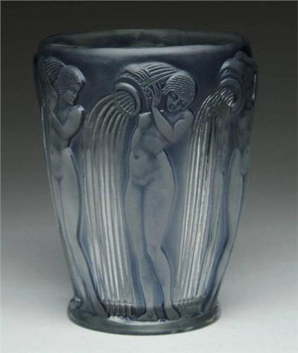 LALIQUE DANAIDES VASE. Wonderful Lalique vase is surrounded by nude maidens carrying a water vessel on their shoulder with a stream of water spilling to the ground. Maidens and background have a blue patination while cascading water is clear. Signed on the underside in raised block letters "R. Lalique". SIZE: 7-1/4" t. CONDITION: Very good to excellent. 5-62425