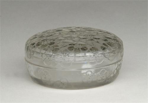 LALIQUE EMILIANE BOX. Nice round Lalique box has allover pattern on lid of five petal flowers with matching more sparse flower design wrapping around the base. SIZE: 3-1/2 in. dia. CONDITION: Very good to excellent. 5-61562