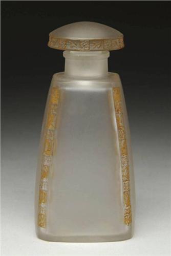 LALIQUE FLORET BOTTLE. Lovely Lalique scent bottle has frosted glass with impressed floret pattern down each corner and around the rim of the stopper. Marked on the underside in raised letters "Lalique" with a long "L". SIZE: 5" t. CONDITION: Tiny fleabite to lip of bottle, otherwise very good to excellent. 5-62443