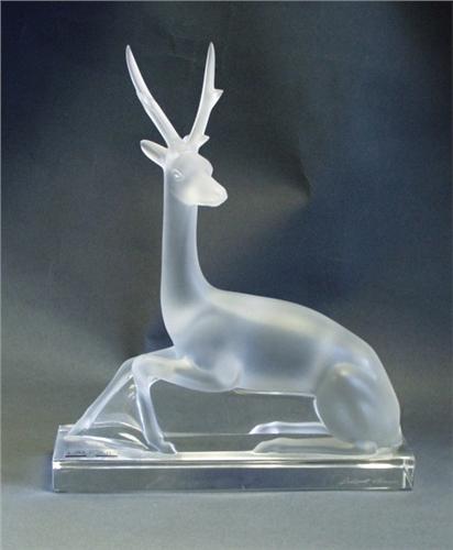 LALIQUE, FRANCE - A frosted glass figure of a reclining deer. 11" high. Signed. With original labels. A rare discontinued model.