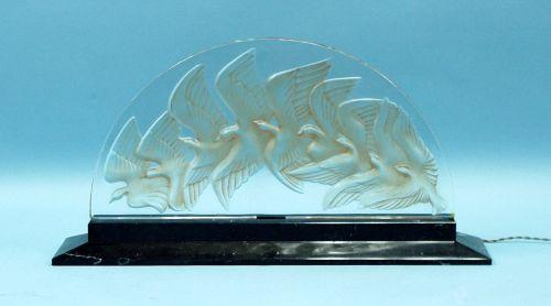 LALIQUE, FRANCE - An important brown patinated French glass relief plaque designed by Marc Lalique. The semicircular panel relief sculpted with birds in flight, fitted on a black marble stand. Signed. Wired for electricity. 25 1/2" long, 13 3/4" high. Circa 1950.