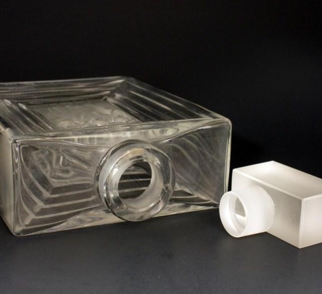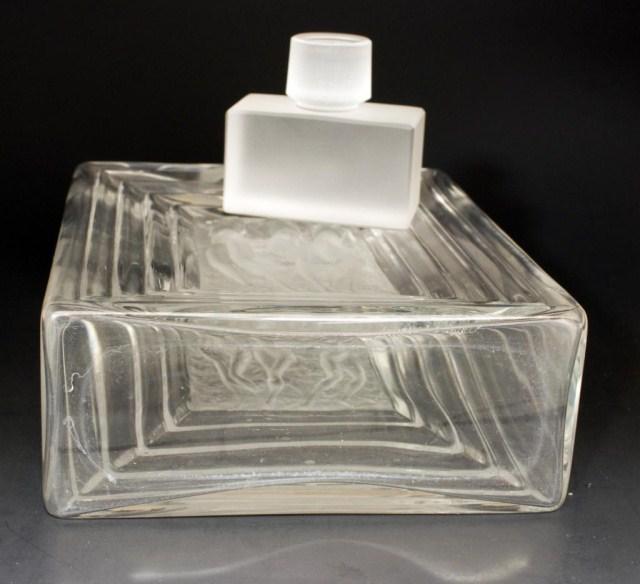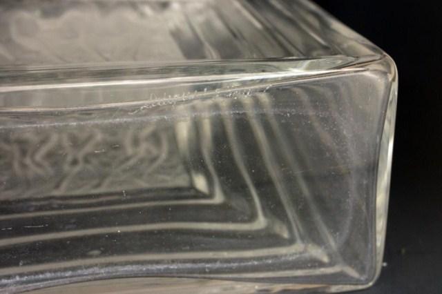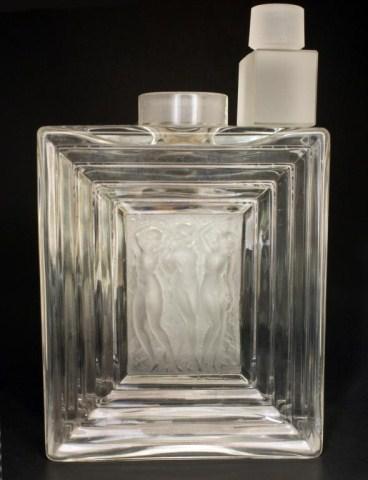 Lalique Crystal Perfume Bottle Decanter Signed. This is a gorgeous Lalique perfume bottle. This is a Flacon Duncan Perfume Bottle number 3 It will hold 18.5 oz.. It is signed on the bottom with the Lalique signature. 4 3/4" wide x 6.5" tall (excluding stopper) by 2" deep.
