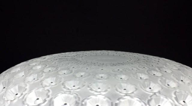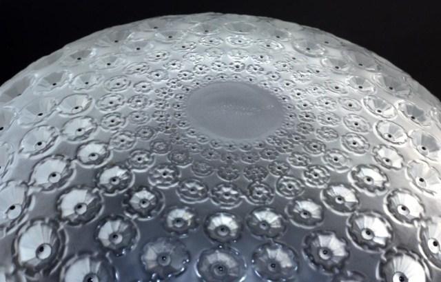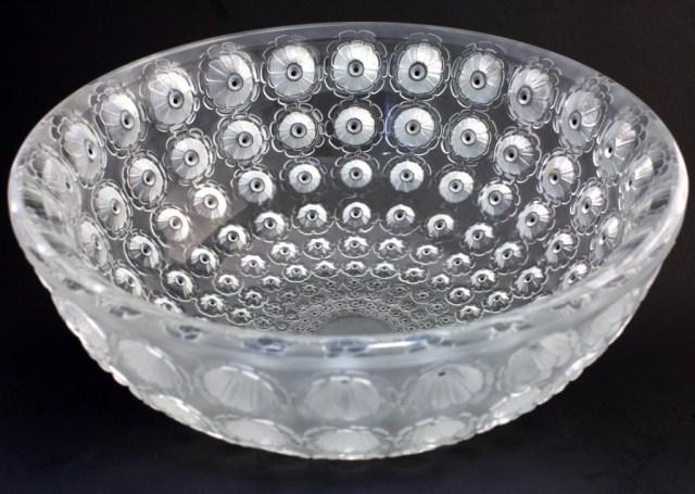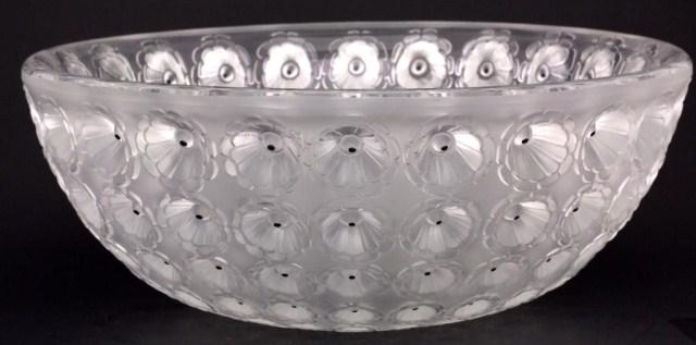 Lalique France Crystal floral bowl. Titled "Nemours". Designed by Rene Lalique (1860 - 1945) in 1929. Depicts numerous indented flowers throughout. Signed under base. Measures 3 3/4" height x 10" diameter. Has a retail value of $1,400.00.