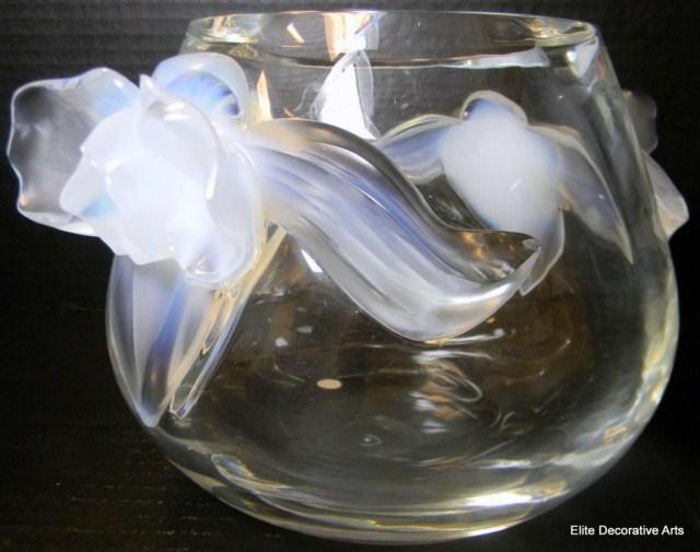 Lalique France crystal orchid floral vase. Titled "Orchidee" and designed in 1930. The orchids have a beautiful opalescent coloring. Measures 6 1/4" height. Has a retail value of $3,195.00.