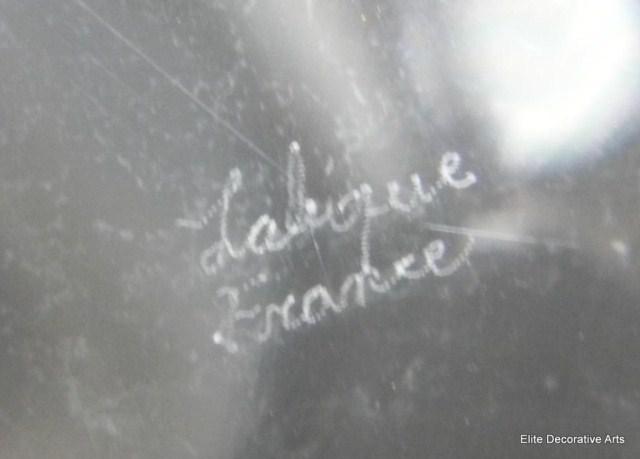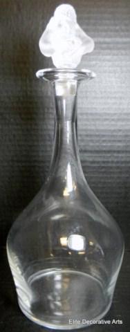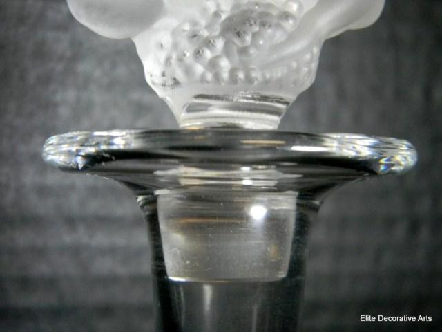 Lalique France crystal Roxane decanter. Auction includes original stopper. Stopper depicts 2 nude female figures holding on to bunches of grapes. Decanter is 10 1/8" height (13" height with stopper). Some mineral deposit discoloration. Discontinued.