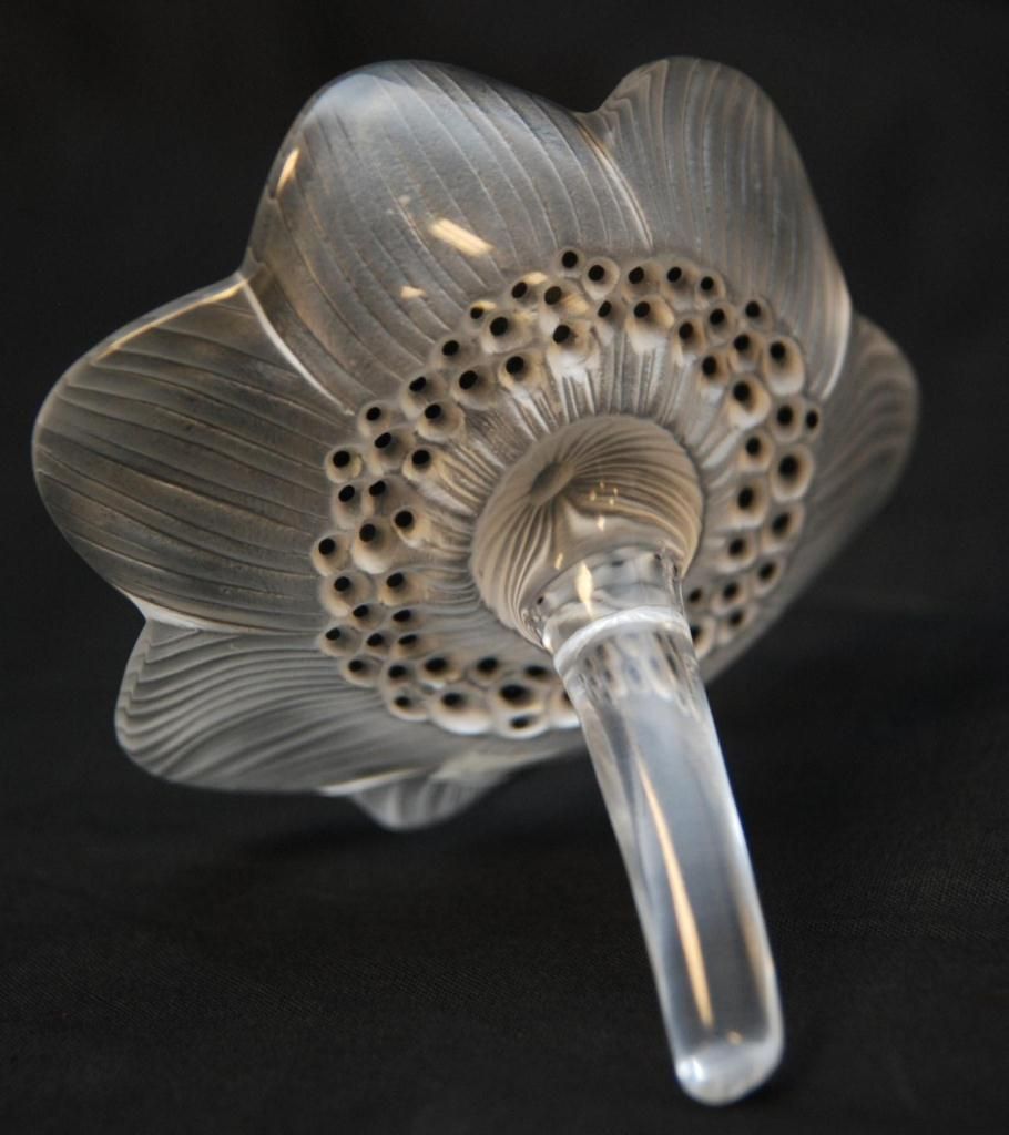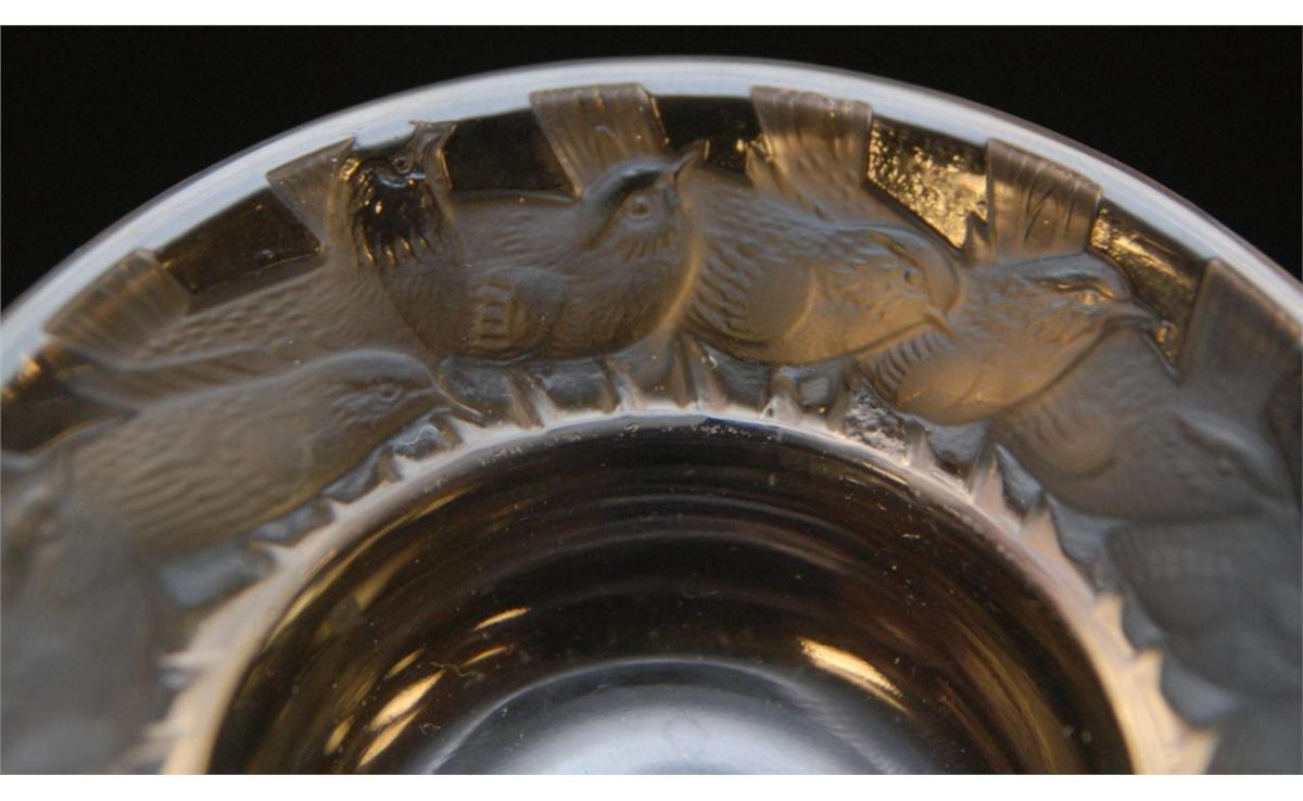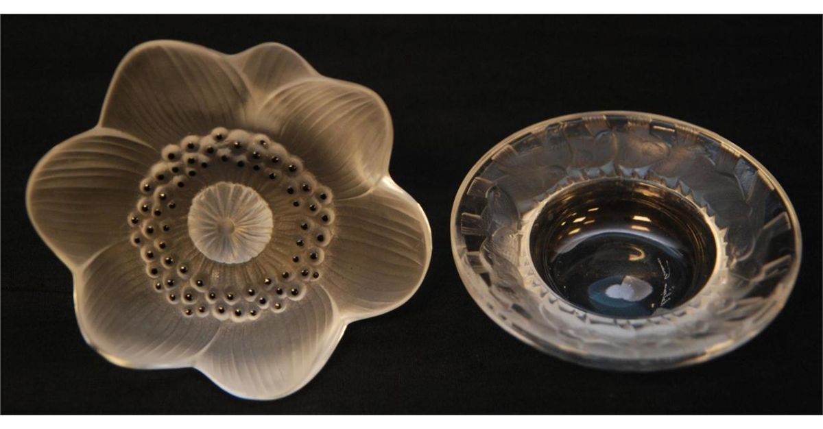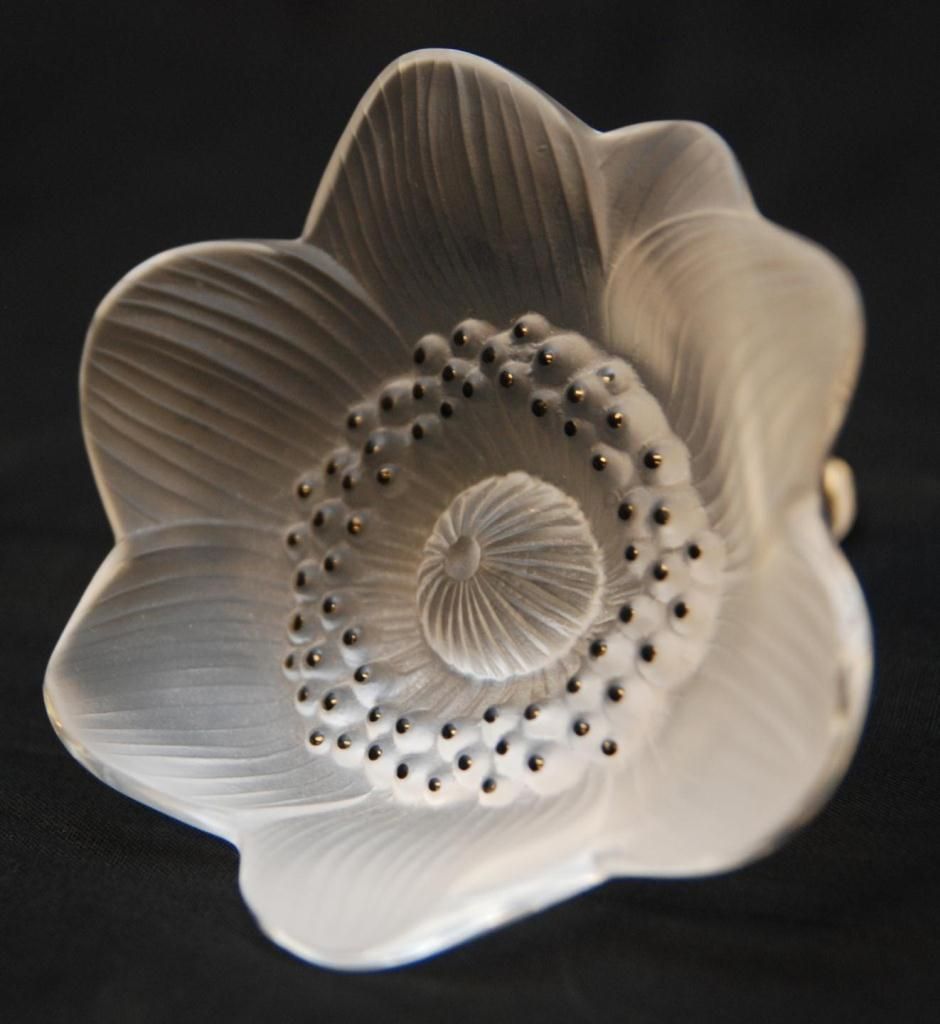 Lalique French crystal figural 'Anemone' flower and birds dish. Largest measures approx. 3 3/4" height (9.5cm). Total weight of 394 kilograms.
