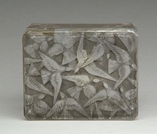 LALIQUE HIRONDELLES BOX. Very nice cigarette box has birds in flight impressed across the top with diamond design on sides. Top is finished with gray patination. Signed on the underside in script "R. Lalique France". SIZE: 3-1/8 in. x 4 in. CONDITION: Small chip on edge of box and bruise on edge of lid. 5-61561