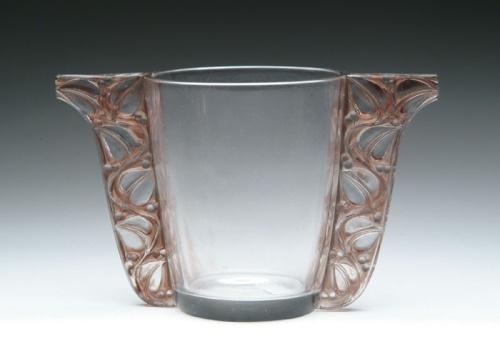 LALIQUE HONFLEUR VASE. Very fine Lalique vase features large pressed handles with flowing leaf design. Handles are patinated in brown. Signed on the underside in engraved block letters "R. Lalique France" and "No. 994". SIZE: 5-1/2 in. t. CONDITION: Very good to excellent. 5-61362