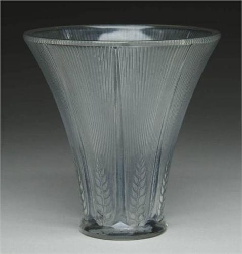 LALIQUE IBIS VASE. Nice Lalique vase has eight panels of vertical ribs with an impressed head of wheat at the base of each panel. Vase has very light blue patination and is signed on the underside in etched block letters "R. Lalique France". SIZE: 6-1/2" t. CONDITION: Very good to excellent. 5-62427