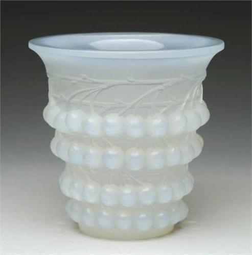 LALIQUE MONTMORENCY VASE. Beautiful Lalique vase is done in deep opalescent glass with four rows of deeply impressed cherries encircling the vase. Signed on the underside with etched signature in block letters "R. Lalique". Vase has been drilled to make it a luminaire. This was shown in Lalique's 1932 Christmas catalogue as a luminaire. SIZE: 8" t. CONDITION: Tiny fleabite to lip, otherwise very good to excellent. 5-62426