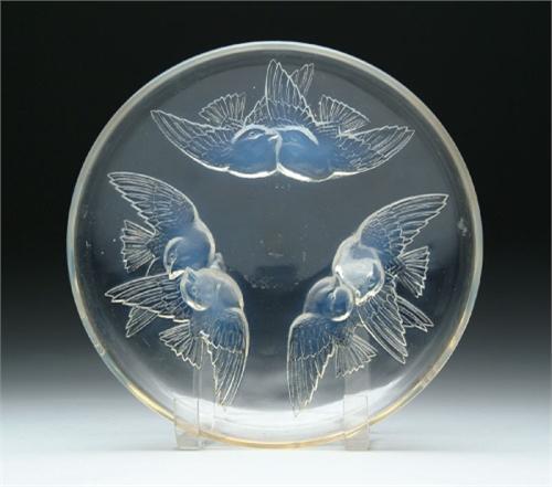 LALIQUE NONNETTES BOWL. Lovely Lalique bowl has pressed figures of birds behind a clear glass bowl. Birds have lightly opalescent bodies. Signed on the underside "R. Lalique France". SIZE: 8-3/4 in. dia. CONDITION: Very good to excellent. 5-61244