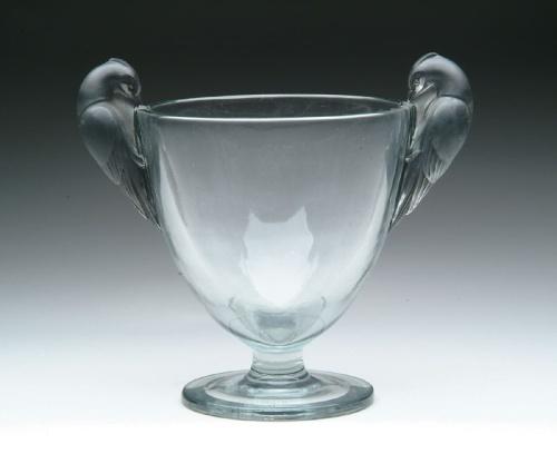 LALIQUE ORNIS VASE. Very nice Lalique vase in Ornis pattern has clear bowl and stem with bird handles. Birds are finished in gray patination. Signed on the underside "R. Lalique France". SIZE: 7-3/4 in. t. CONDITION: Very good to excellent. 5-61361