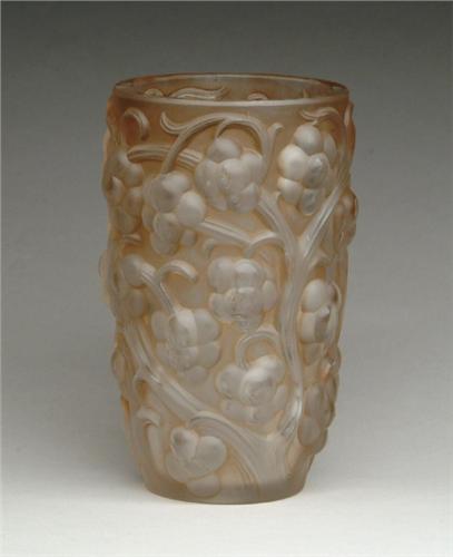 LALIQUE RAISINS VASE. Beautiful Lalique vase has deeply impressed vines and berries encircling the entire vase. Glass is finished with amber patination. Signed on the underside "R. Lalique France" in block letters. SIZE: 6-1/4 in. t. CONDITION: Very good to excellent. 5-61565