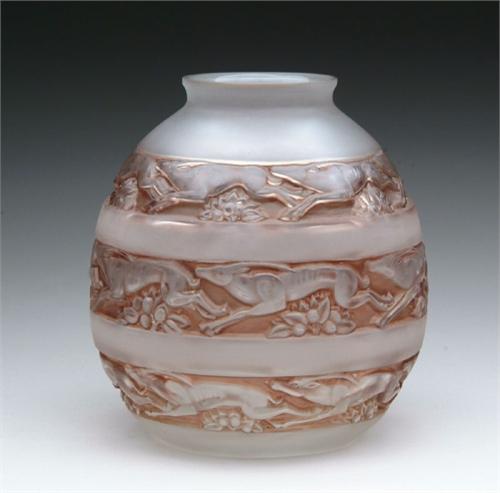 LALIQUE SOUDAN VASE. Fine Lalique vase features three horizontal panels of running gazelle. Panels have brown patination in background. Signed on the underside in block letters "R. Lalique France". SIZE: 7 in. t. CONDITION: Very good to excellent. 5-61243