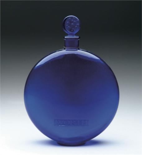 LALIQUE WORTH SCENT BOTTLE. Beautiful large Lalique scent bottle is done in cobalt blue with the name "Worth" impressed on the lower third of bottle. The original stopper is impressed with a crescent moon and stars. Original cord which held paper tag remains with bottle, however tag is missing. Faintly signed on the underside "R. Lalique" and etched with "816H". SIZE: 9-3/4 in. t. CONDITION: Tiny chip to inside lip, otherwise very good to excellent. 5-61360