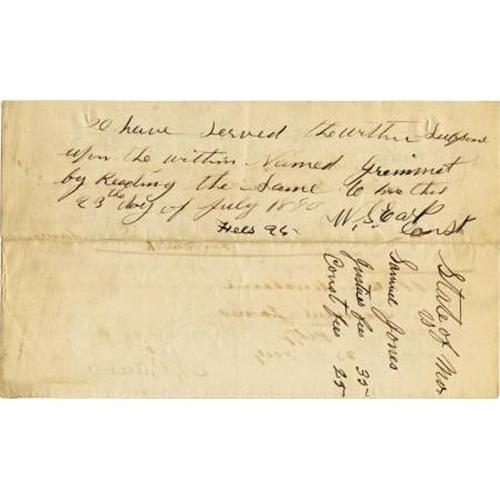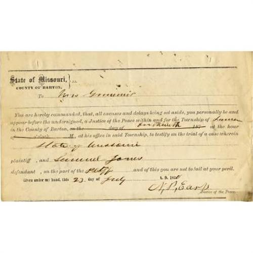 <B>THE EARLIEST KNOWN SIGNATURE OF "WYATT EARP" CIRCA 1870</B></I> - Wyatt Earp and his family moved to Lamar, Missouri around 1869. Nicholas Earp at some point became the Constable for Lamar. However, on November 17, 1869, Nicholas offered his resignation as Lamar's Constable. His resignation was accepted and he was immediately appointed to the position of Justice of the Peace. On the same day Wyatt Earp, who was only twenty-one years-old, was appointed as Lamar's new town Constable. This appears to have been his first known law position. This extremely rare early document, being one of the earliest known documents signed by <I>“WYATT EARP”</B></I> as a lawman and the beginning of the 'Earp Legend!'<BR><BR>Court summons document reads as follows: State of Missouri, County of Barton to <I>“Mrs. Grimmer”</B></I> You are herby commanded, that, all excuses and delays being set aside, you personally be and appear before the undersigned, a Justice of the Peace within and for the Township of <I>“Lamar”</B></I> in the County of Barton, on ____ day of <I>“Fourteenth”</B></I> 187_ at the hour of ____ o'clock,____M., at this office in said township, to testify on the trial of a case wherein <I>“State of Missouri”</B></I> plaintiff, and <I>“Samuel Jones”</B></I> defendant, on the part of the party of the <I>“pltiff”</B></I> (plaintiff) and of this you are not to fail at your peril. Given under my hand, this <I>“23”</B></I> day of <I>“July”</B></I> A. D. 187<I>”0”.</B></I> <I>“N. P. Earp”</B></I> Justice of the Peace.<BR><BR>Verso: In Wyatt Earp's hand, <I>“I have served the written Subpoena upon the within name Grimmer by reading the same to her this 23th day of July 1870 W. S. Earp Const Fees 25 State of Mo. V (versus) Samuel Jones Justice fees 35 Court fees 25”</B></I><BR><BR><b>Shipping:</b> Flat Material, Small (<a target="_blank" href="http://www.heritageauctions.com/common/shipping.php">view shipping information</a>)