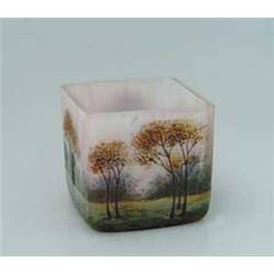 Lot 1266 LAMARTINE CAMEO VASE. Beautiful Lamartine cameo vase is square in shape and decorated with cameo and enamel trees and meadow against a pink background. Color in glass is achieved by casing the interior of the square vase with a mottled pink and white glass. Engraved signature on the side of the vase "Lamartine". Numbered on the bottom of the base "327/594". SIZE: 2-1/2" t x 2-3/4" sq. CONDITION: Very good to excellent. 5-68913 (500-700)