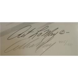 LAMAY, ART CANADIAN GEESE PRINT. Depicts 5 Canadian geese in water. Signed in lower right. Numbered 405/1500. 57.5" x 29" framed & matted.