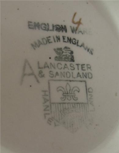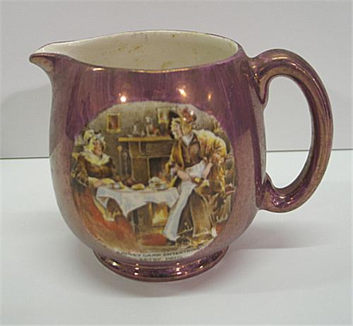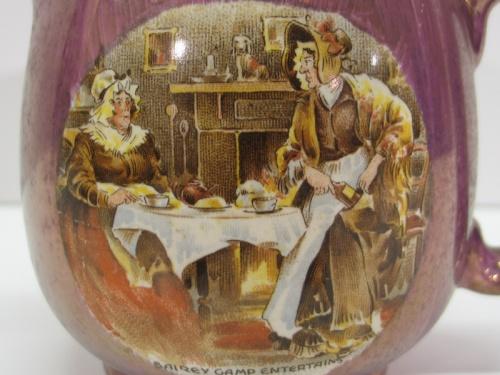 LANCASTER PURPLE LUSTER CREAMER. Decorated on body with scene depicting two elderly women. Scene is titled "Sairey Camp Entertains Betsy Prig". Marked on bottom "English Ware-Made in England-Lancaster and Sandland-Hanley England". 4" H