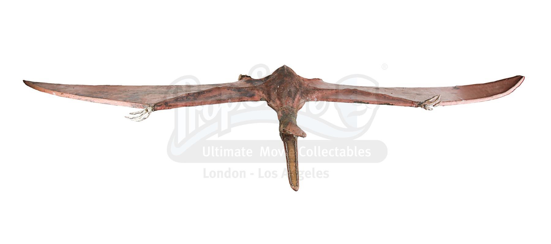A full-size special effects pterodactyl from Kevin Connor's fantasy adventure The Land that Time Forgot. Pterodactyls were one of the first creatures to be seen inhabiting the land of Caprona, often flying overhead or swooping down to attack the natives. In later scenes, Bowen Tyler (Doug McClure) and his team attempted to fly over the mountain wall of Caprona in an ambitious arial contraption, which was attacked and forced down by an aggressive pterodactyl.