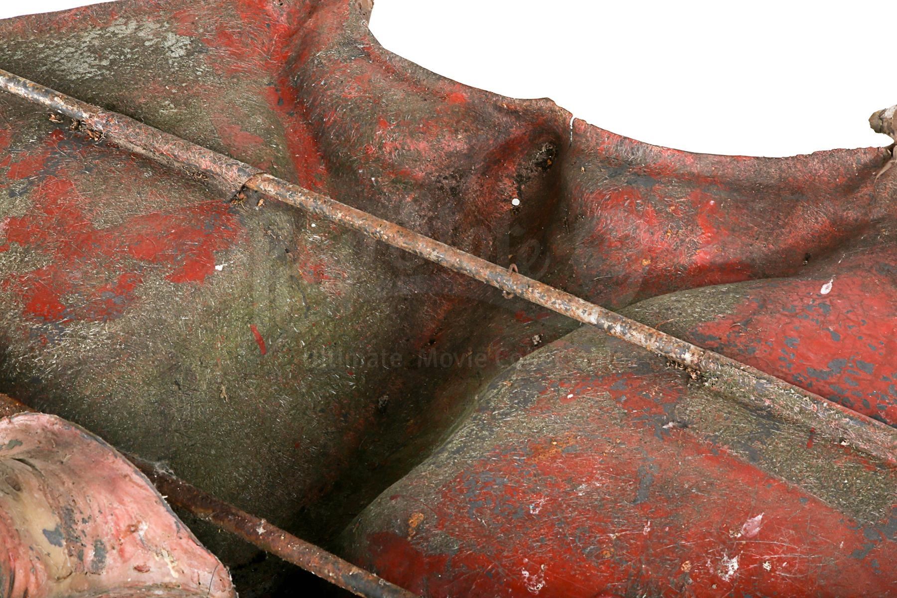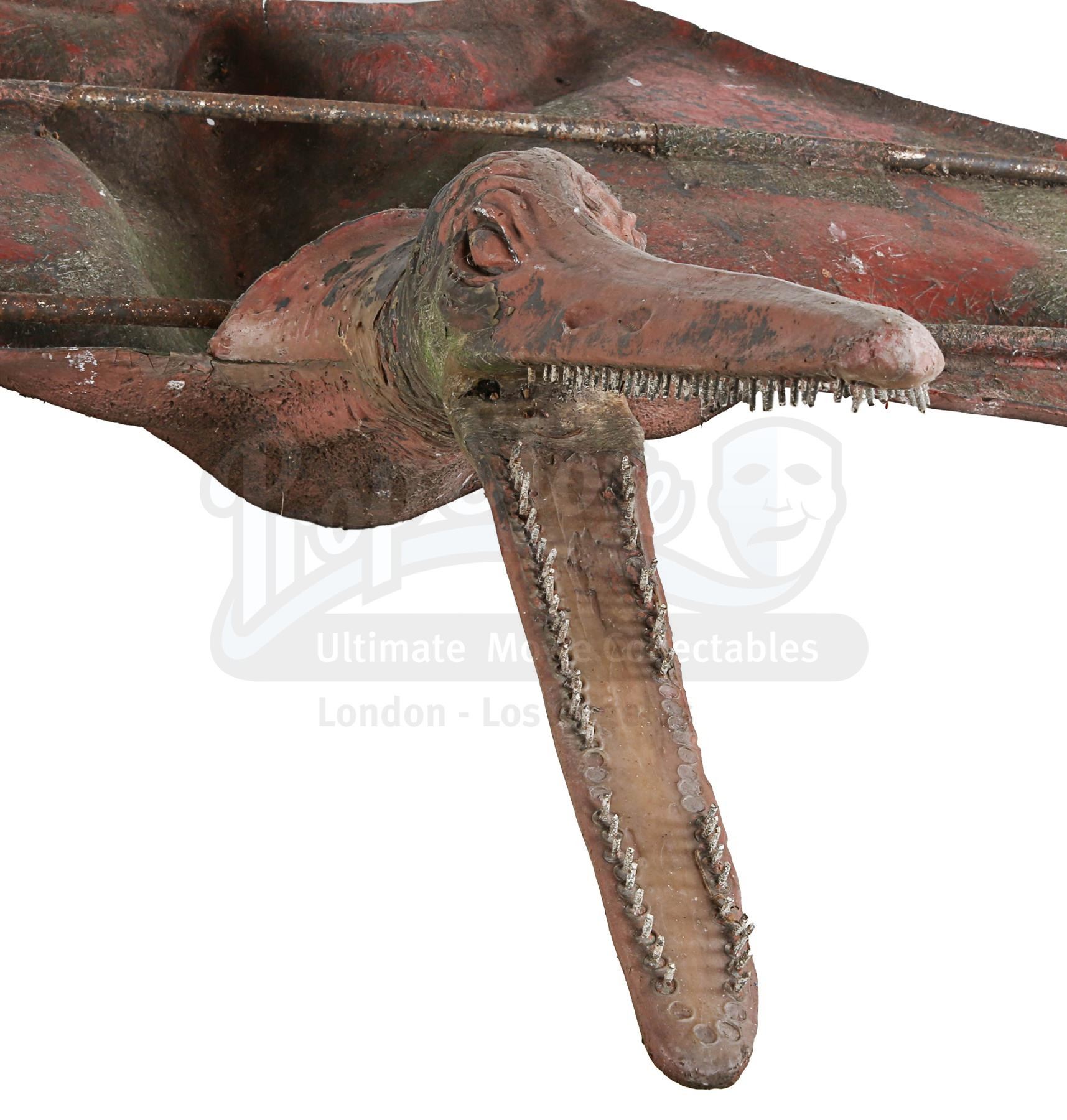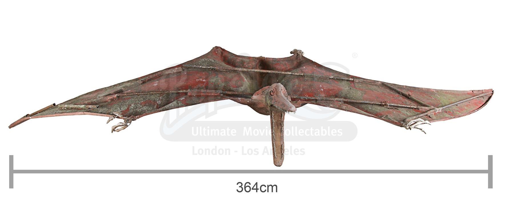 The main body of the creature is made of fibreglass. Only the underside is textured, suggesting the creature was made to only be seen from beneath. The fore and rear talons are made of resin with wire core, and the head is made of fibreglass, with metal screws glued to the mouth to resemble teeth. It is supported by metal pipes which act as scaffolding and are attached to cables that allowed the special effects crew to control the creature like a puppet. The pterodactyl shows significant signs of wear and aging: the colour has faded, there are patches of rust, several teeth have been lost and the fore and rear talons have cracked and warped over time. Dimensions: 157 cm x 364 cm x 49 cm (61 3/4" x 143 1/4" x 19 1/4")