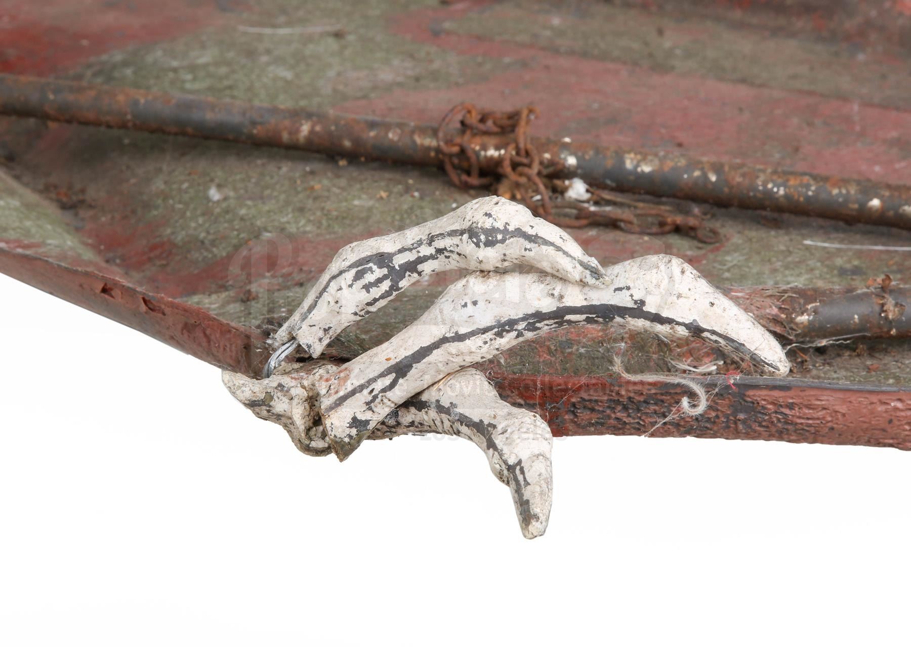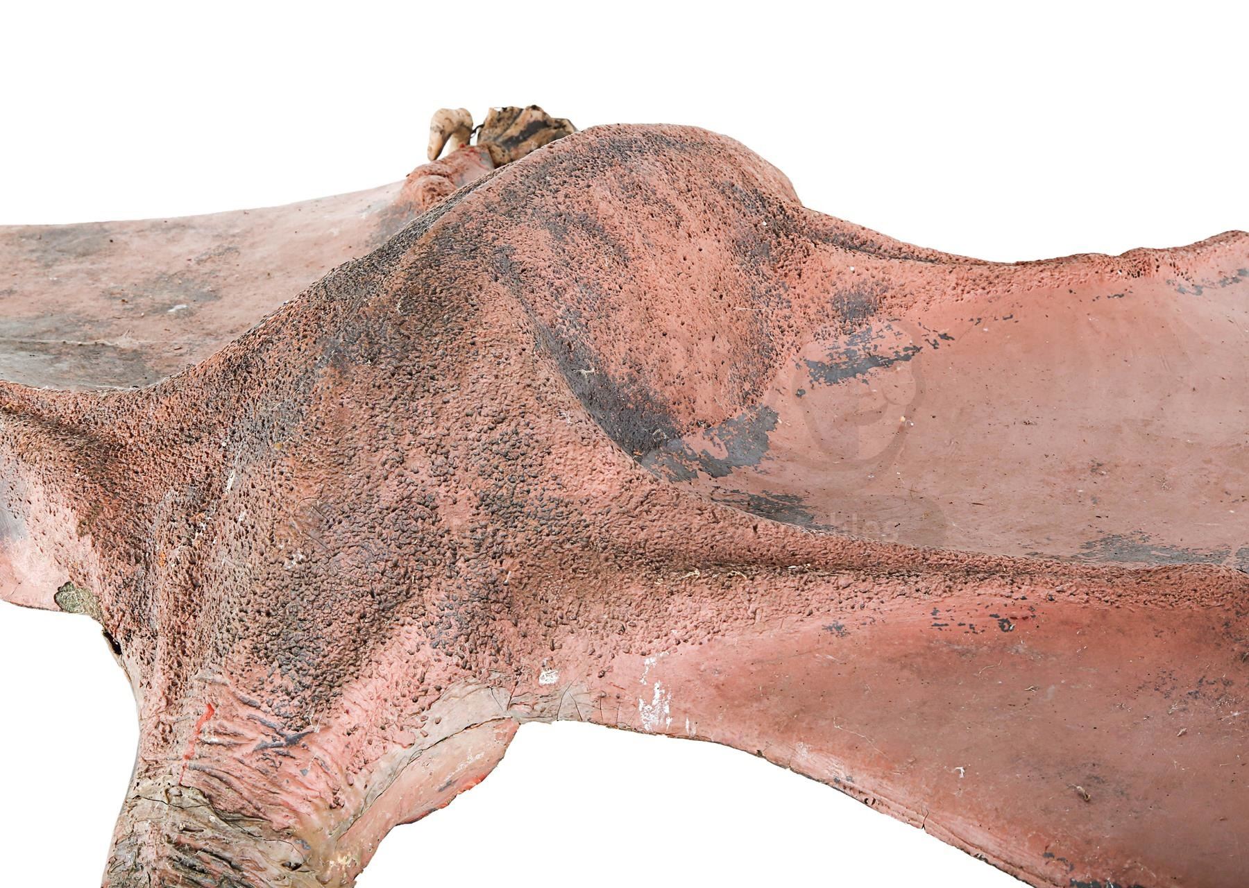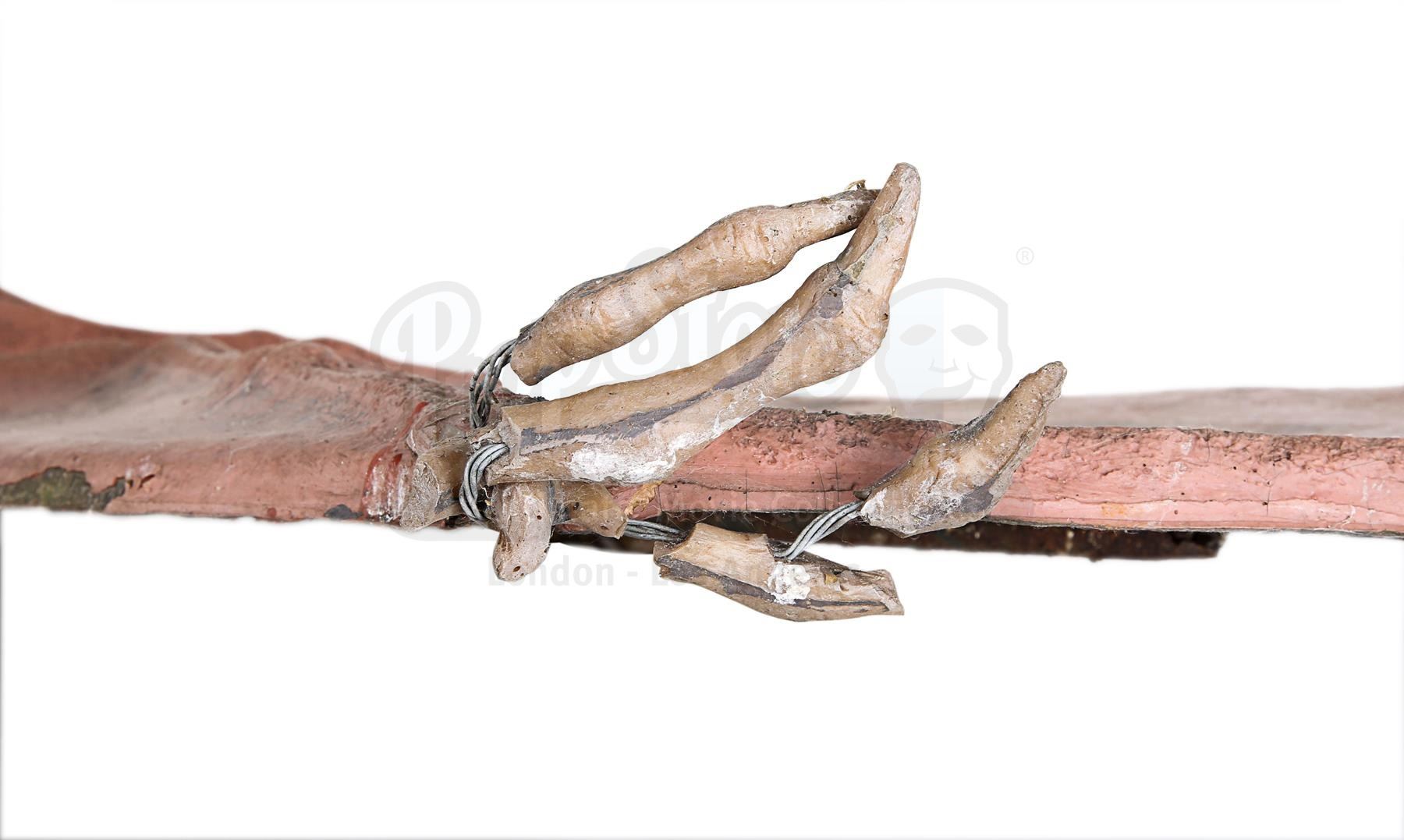 The main body of the creature is made of fibreglass. Only the underside is textured, suggesting the creature was made to only be seen from beneath. The fore and rear talons are made of resin with wire core, and the head is made of fibreglass, with metal screws glued to the mouth to resemble teeth. It is supported by metal pipes which act as scaffolding and are attached to cables that allowed the special effects crew to control the creature like a puppet. The pterodactyl shows significant signs of wear and aging: the colour has faded, there are patches of rust, several teeth have been lost and the fore and rear talons have cracked and warped over time. Dimensions: 157 cm x 364 cm x 49 cm (61 3/4" x 143 1/4" x 19 1/4")