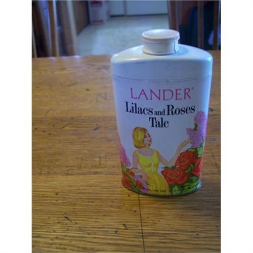 This is a wonderful Talc tin called Lilacs and Roses by LANDER.Lots of powder left in this tin.Scuff mark near top on one side and crack in lid.Great colors and graphics. These are great displayed in a bedroom or bath.This tin is 5 1/2" tall to top of lid.