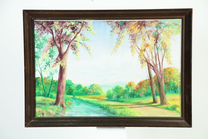 Acrylic on canvas, signed at bottom. Probably an Indiana landscape with birches. Retains Indiana gallery label. In a frame, 23 1/2"h. 33 1/4"w.