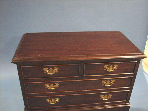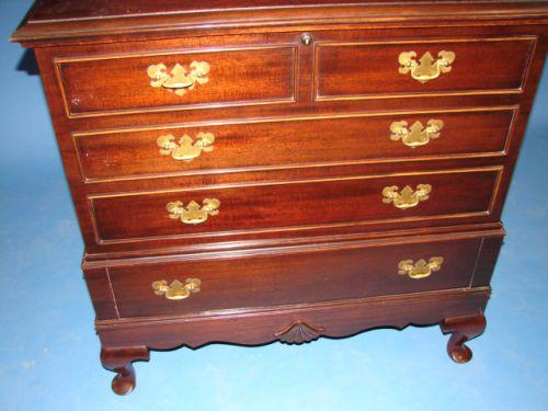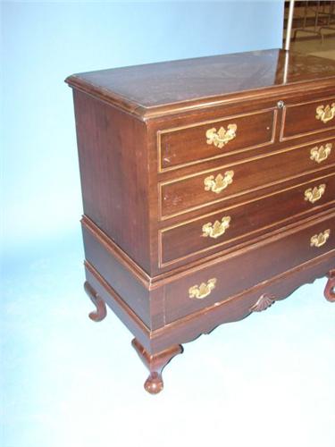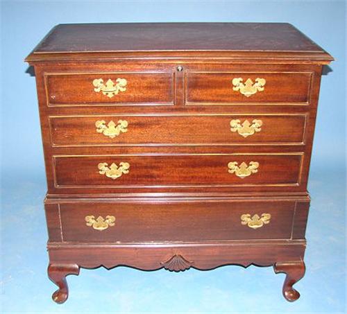 LANE QUEEN ANNE STYLE MAHOGANY CEDAR CHEST. Pad feet. Two over three graduated faux drawers. Shell carving at apron. 35” H, 34” W, 18” D
