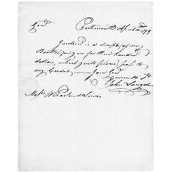 <b>500. JOHN LANGDON</b> (1741- 1819) Signer of the Constitution, Revolutionary military officer and financial supporter of Stark's expedition against Burgoyne. Uncommon A.L.S. 1p. 4to., Portsmouth, April 10 1799 to Wharton Lewis enclosing <i>"...a draft of my Brother's for you for three hundred dollars, which you will please, pass to my credit...</i>". Integral address leaf in Langdon's hand, also signed "<i>Mr. Langdon</i>". Usual light folds, minor chips to left margin, otherwise very good.<b> $800-1,200</b>