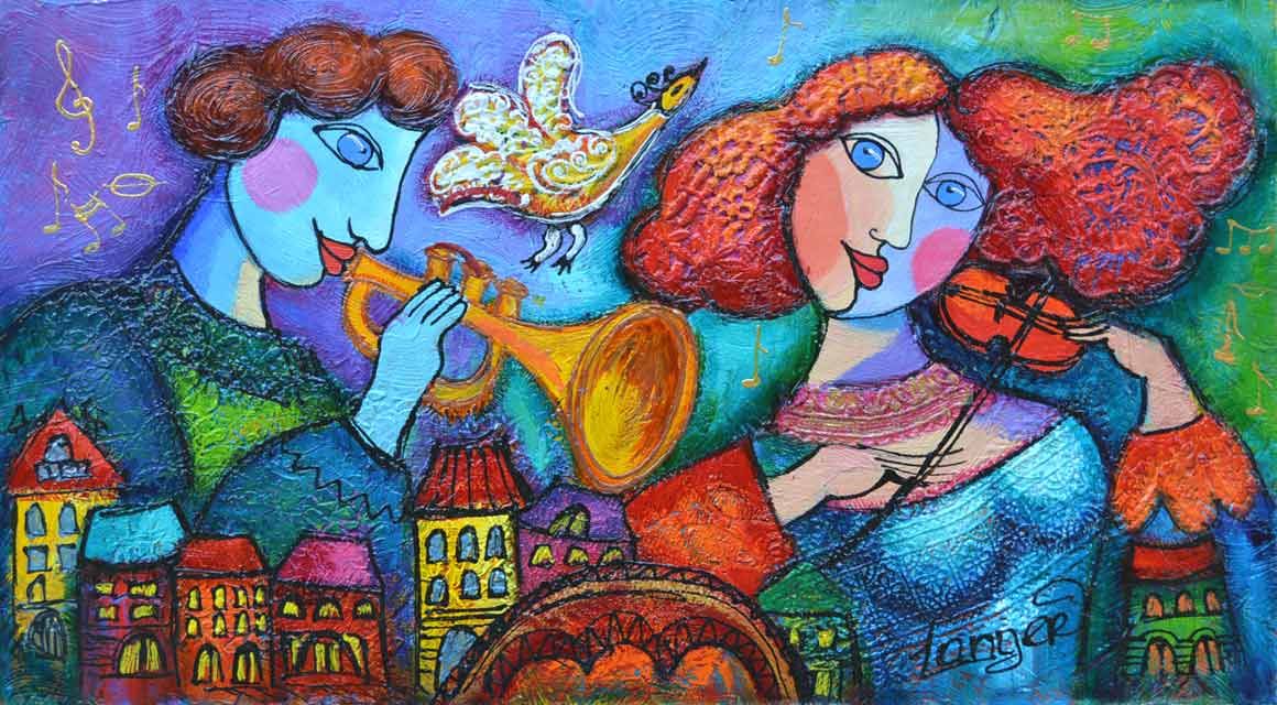 LANGER **HARMONY** ORIGINAL . Artist: Yulia Langer - Title: Harmony - Medium: Original Acrylic on Canvas - Signature: This one-of-a-kind work is hand-signed by the artist at the bottom of the image - Image Size: Approximately 16 ¼ inches x 29 ¾ inches - Framed: Unframed on Unstretched Canvas - Details: This work comes with a Certificate of Authenticity - Biography: Yulia Langer was born in Kharkiv, Ukraine in 1972. After studying Art in Skovoroda, Kharkiv National University, Yulia continued teaching Fine Arts for a number of years. In 2003 Yulia moved to Israel, settling near Tel Aviv, and began focusing on her passion - painting. - Yulia Langer's canvases are a fusion of story, form and color. Romance and intimacy are reoccurring themes in her paintings, while in the background the viewer will find motifs of surrealism and naivety along with a certain musical subtext. Texture plays an important role in Langer's art. Various techniques, such as collage, music scores, lace and crochet, relief work, metallic paints and golden leaves, along with an uninhibited use of strong colors, are part of Yulia creations. In her paintings one can feel the presence of Marc Chagall, one of the great masters of the 20th century, and of the late Theo Tobiasse. - Today, you can find Langer's paintings in top galleries, and distinguished, private collections throughout the world. - Warranty: Item GUARANTEED to be as described