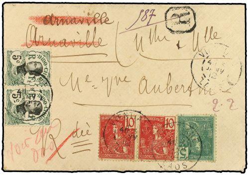 1912 Registered envelope to FRANCE bearing Indo-China 5c green (Yvert 27), 10c red (pair) (Yvert 28) and 5c green (pair) (Yvert 44) tied by VIENTIANE LAOS double ring with boxed hand.struck REGISTERED routed via Saigon with ARNAVILLE arrival on reverse. Very fine item of registered mail from Laos.