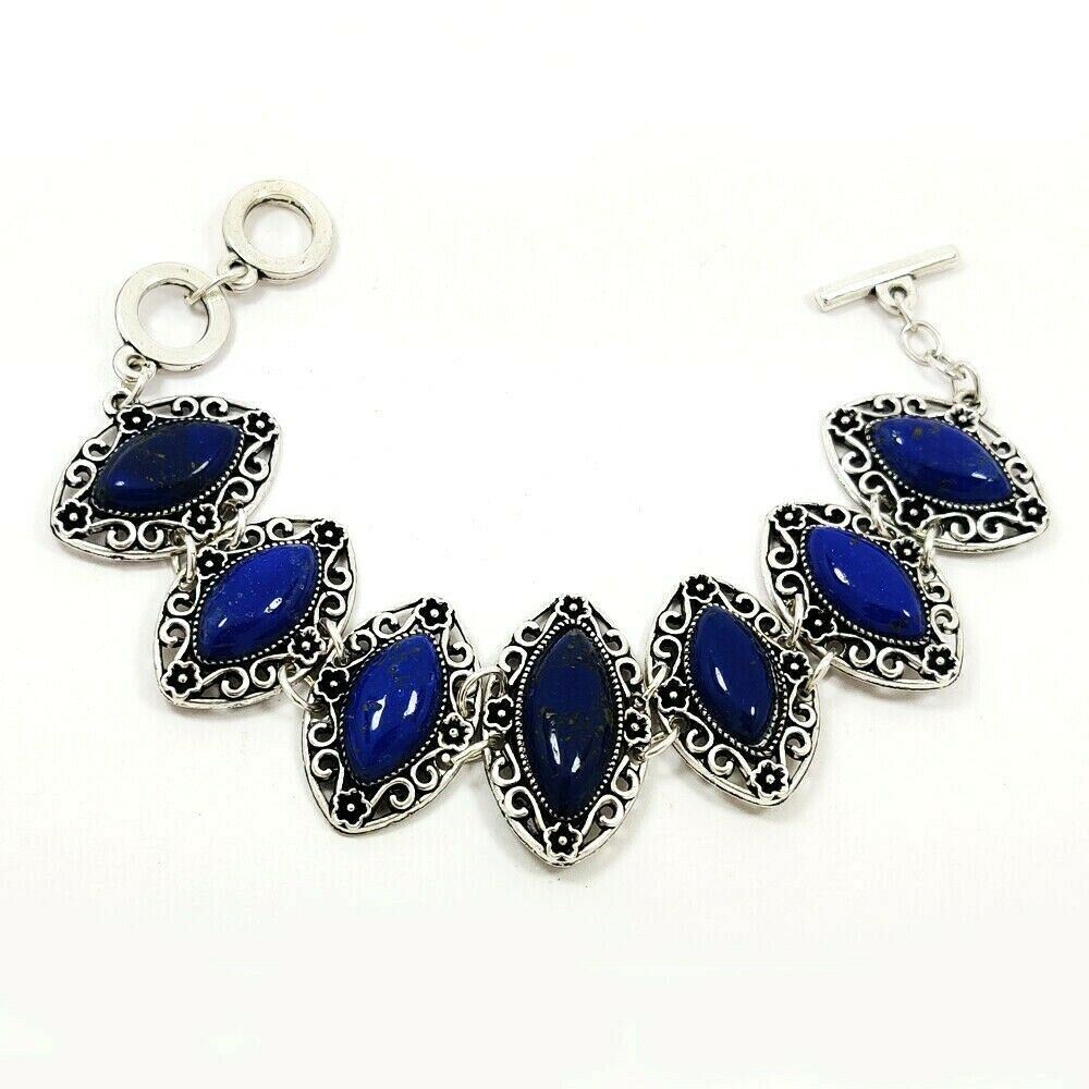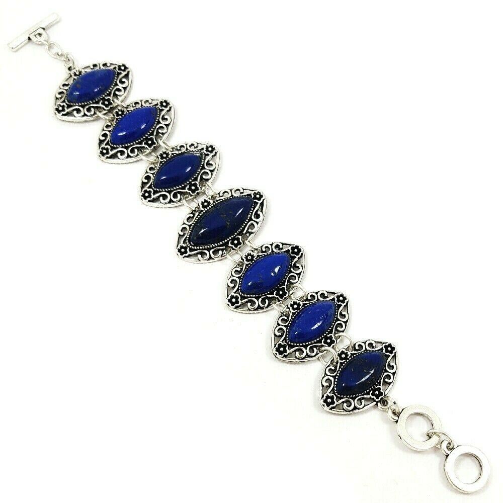 LAPIS LAZULI GEMSTONE SILVER PLATED BRACELET JEWELRY , Gemstone : Lapis Lazuli , Gemstone Size : 9x18mm , Gemstone Shape : Marquise , Gemstone color : Blue , Base Metal : White Brass , Metal Purity : Silver Plated , Bracelet Size : 8 Inches (With Adjustable Links) , Bracelet Weight Weight : 27.600 Gram , Product Code : SGJBRA1009.