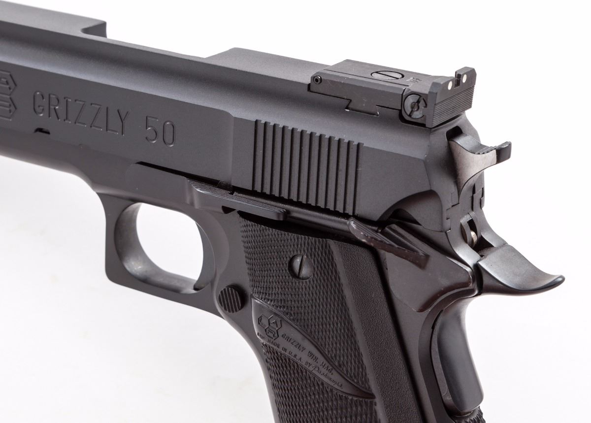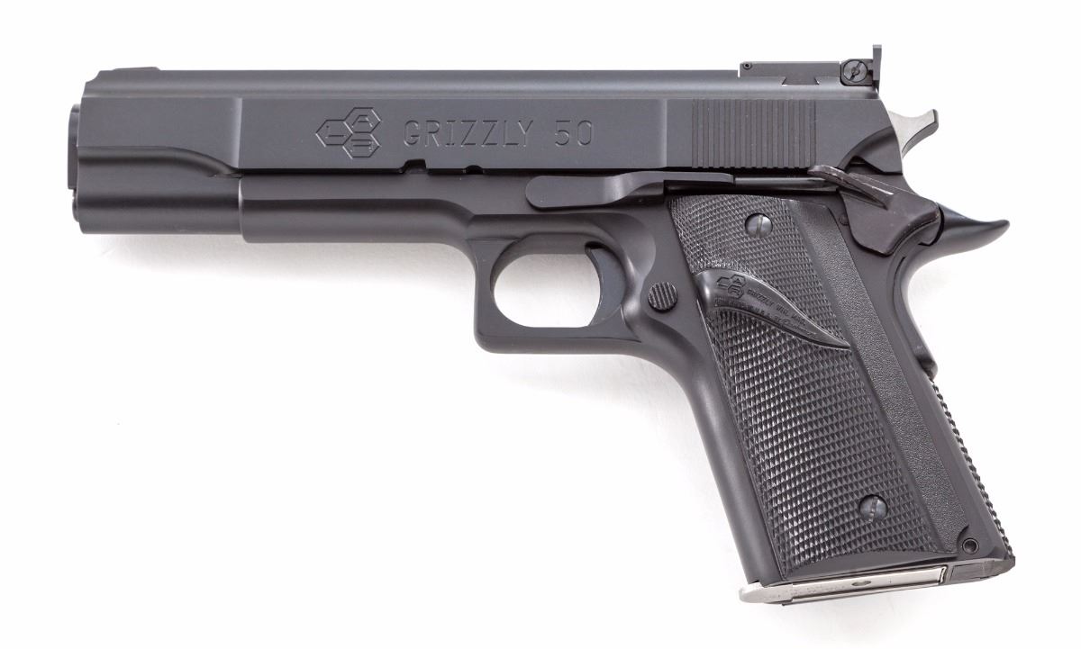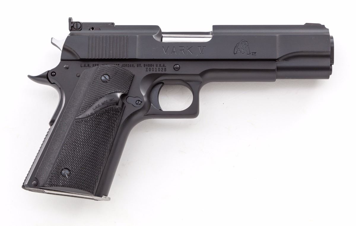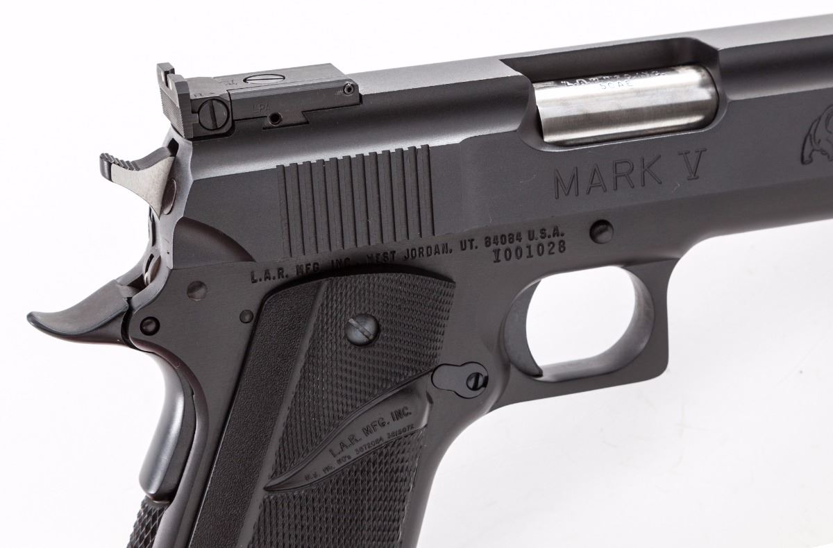 LAR Grizzly MK V Semi-Automatic Pistol, #V001028, .50 AE cal., 5-3/8'' barrel, matte black finish, checkered black hard rubber LAR Pachmayr grips, beavertail grip safety, checkered back grip strap, white dot front sight, adjustable two-dot white rear sight, serrated trigger and hammer, with one factory magazine and small LAR adjustment tool. Condition is excellent. Matte metal surfaces show light marks from handling. Thumb safety with mild spotting and discoloration. Grips and action are like new, bore is bright. Est.: $1,200-$1,800. (Modern/PPT)