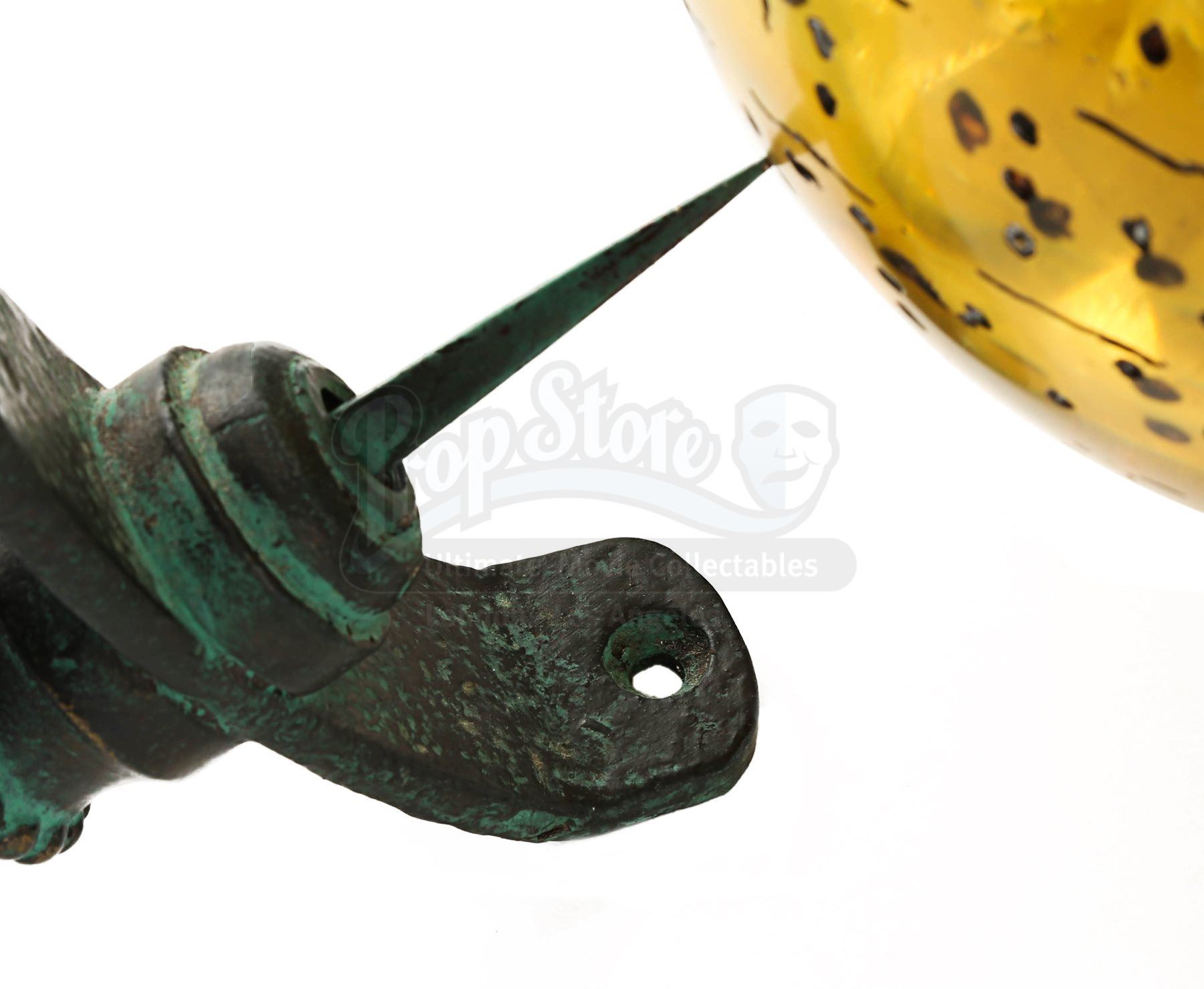 The solid resin sphere is an amber colour; lines and circular marks throughout its outer and inner surfaces represent the ancient code used to activate its powers. Inside, reflective, textured materials create a mysterious appearance. The metal holder has been distressed to resemble aged, pitted copper. Sharp, narrow spikes protrude inward from the arms and apex of the holder, with ancient Grecian detail adorning the base of each. An open base and screw holes allow for fixing to a support. The Orb features some wear and scratching from production use, while the Orb Holder shows production-based marking and wear, with minor discolouration from age.