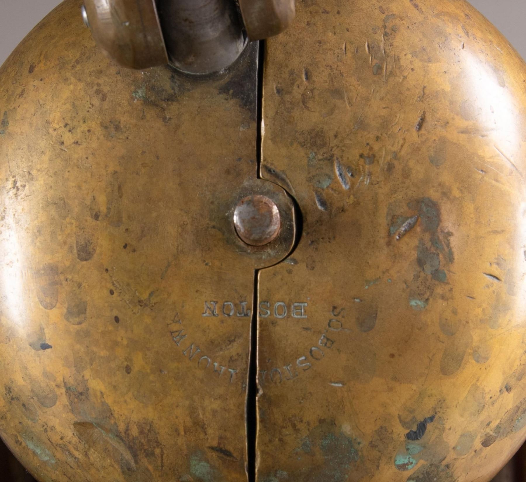 SALUTE CANNON. Cal. 1 7/8" w/ 10 Ga. insert. S# 10. Bbl. 26.5"; 1.52" diameter at muzzle. Mfg. by South Boston Ironworks of Boston, Mass; Patent date of June 8, 1881 above chamber. Clam shell two piece opening to breech with "S Boston Ironworks" marking. Breech has 10 gauge adapter with screw retention. Cannon is housed in hardwood carriage with brass fixtures & wooden wheels. Includes elevation adj. platform. CONDITION: brass has aged mustard brown patina with spots of verdigris & numerous handling marks. Case has heavy varnish with numerous dings & marks. Right wheel has large chip missing. Bore shows pitting throughout. (02-25048/MD). NON-GUN. $6,000-10,000.