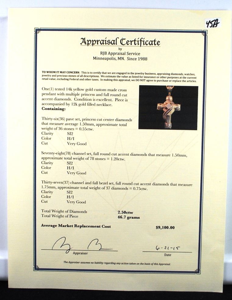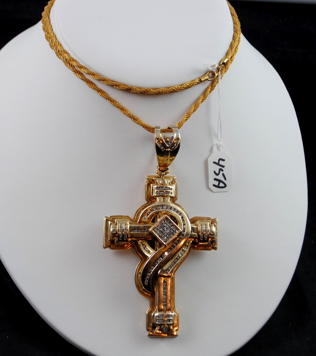 CUSTOM MADE 14K YELLOW GOLD CROSS/PENDANT WITH MULTIPLE AND FULL CUT ACCENT DIAMONDS. THIRTY-SIX PAVE SET, PRINCESS CUT CENTER DIAMONDS WEIGHING 0.55CTW, SI2 CLARITY, H-I COLOR. SEVENTY-EIGHT CHANNEL SET, FULL ROUND
