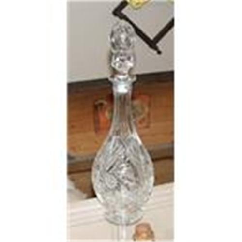 This is a very large beautiful cut glass decanter with a pinwheel pattern. It is 16" tall to the top of the stopper. It is in mint condition with no chips or cracks and the glass is clear. This size is pretty unusual.