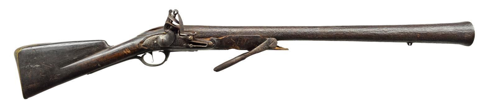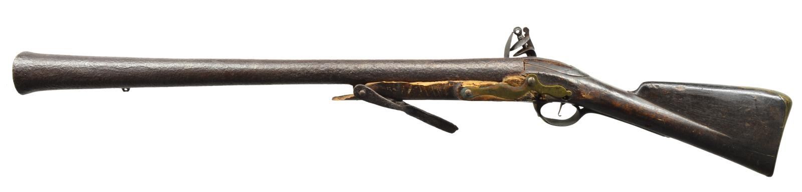 Cal. 2 1/2" at the bell. NSN. 45" Overall. Bbl. 30" rnd. swelling to 2". Hardware appears to be that of a 2nd model Brown Bess though so pitted no proofs can be seen. According to accompanying letter, this relic was bought in Montréal in 1941 & may have had Revolutionary War history from that area. Regardless, this is a rarely seen military issue blunderbuss. UNATTACHED ACCESSORIES: collector notes & letter as noted above. CONDITION: fair, iron is heavily pitted & no markings can be read, brass has dark mixed olive/mustard patina. The stock is sound from the lock back but forward is insect damage & missing wood from swivel forward. Mechanically will still cock, bore is clear w/ heavy pitting. PROVENANCE: From the Collection of John "Tim" Breth Jr. (01-17771/JS). ANTIQUE. $1,000-1,500.