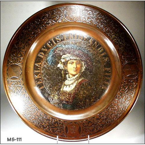 Tekla, Duchess of Friedland, wife of the ambitious, enigmatic Albertus Duke Fridladiae Graf v Wallenstein (1583-1634), the most successful and charismatic general in the Thirty Years War. He had lost the support of the Emperor in 1634 and had withdrawn to Ever in Bohemia, where he was assassinated by Irish and Scottish mercenaries formerly in his service. This large copper charger is embossed, chased, engraved and hand painted (oil) with the portrait of Tekla. Dimension : 16 7/8 inches ( 43 cm) in diameter, excellent condition. We believe this lovely piece is of German origin and dates back to the second half of 19 th century. This is one of a pair, please see other charger of Albertus, Duke of Friedland. Wisconsin residents, please add 5.1% sales tax or your WI resale number. For Ebay Live Auctions photo sizes are automatically reduced (and distorted), so if you want to see larger more detailed pictures, please email us.