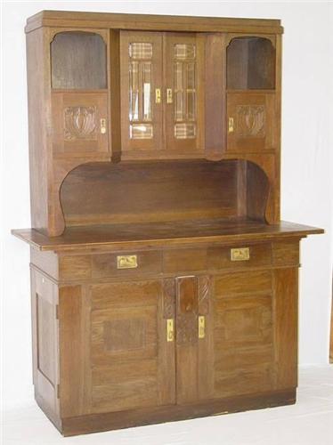 LARGE 2 PC. MISSION OAK SERVER W/ CENTRAL GLASS DOORS and CARVED PANELS - IMPERFECTIONS and WEAR;