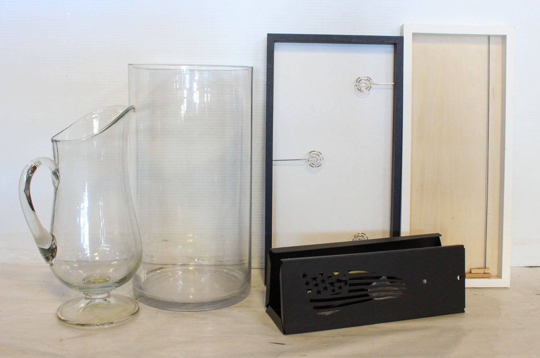 LARGE 20" TALL GLASS VASE, GLASS PITCHER + 2 WALL