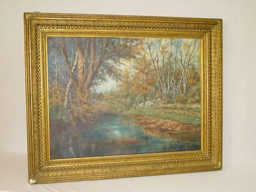 LARGE 20TH CENT. OIL ON CANVAS OF COUNTRY ROAD W/ POND LANDSCAPE SIGNED JOHN RENFREW DEAN (ILLUSTRATOR FOR FIELD & STREAM MAGAZINE) IN FANCY VICT. MOLDED PLASTER FRAME (31" X 41 1/2") - MINOR LOSSES TO FRAME;