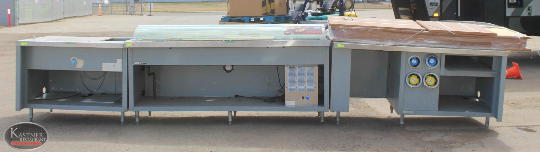 GUARD, & WOODEN FRONT DISPLAY. SANDWICH PREPARATION. MADE BY DUKE. INCLUDES:6-WELL REFRIGERATED LINE M# SUB FC-206, COMPRESSOR REF: R134A, 86.5" X 34" X 37". CABINET W/ 500W STEAM WELL, M# DGKA, SUB SC-206, 120V, 48.5" X 33.5" X 36". STEEL CABINET W/ 2 UNDERSHELVES & 4 SPRING-LOADED CUP DISPENSERS, 33.5" X 72.25" X 36". TOTAL SIZE: 207.5" 34" X 36" (17+ FEET LONG)