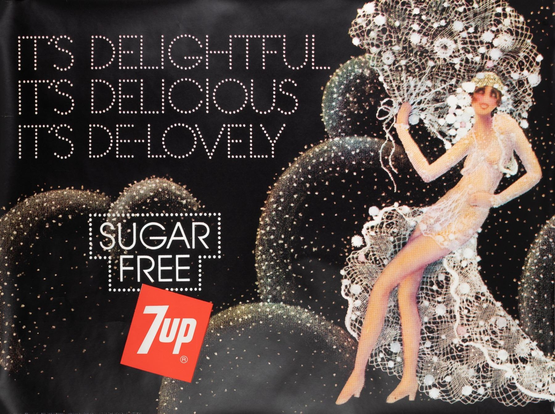 Very large 7Up poster 'It's Delightful - It's Delicious - It's De-Lovely - Sugar Free 7Up', 1975, 59.5 x 45 inches. Minute tear on left edge, else very good.