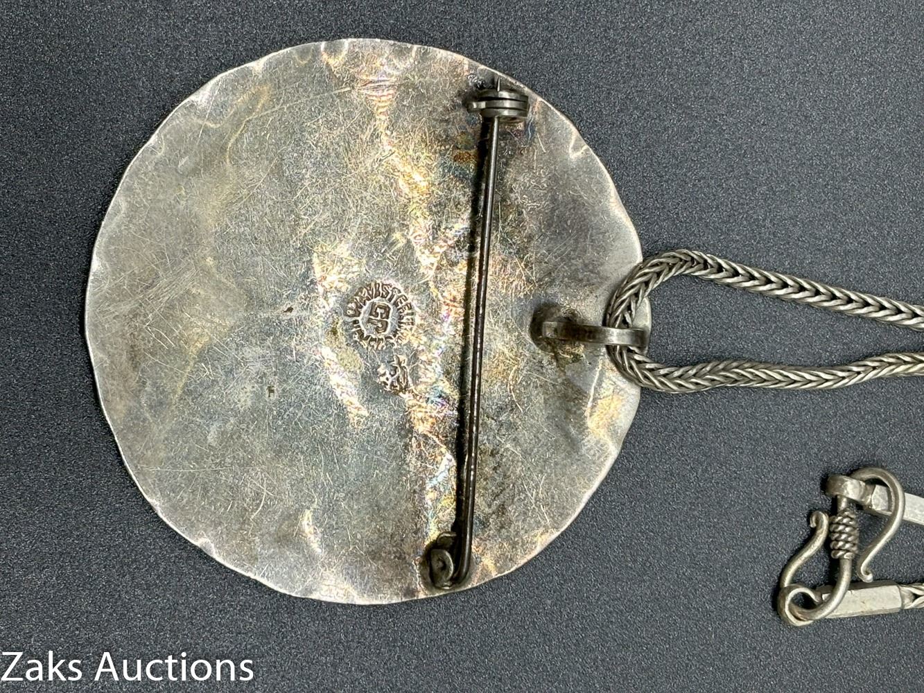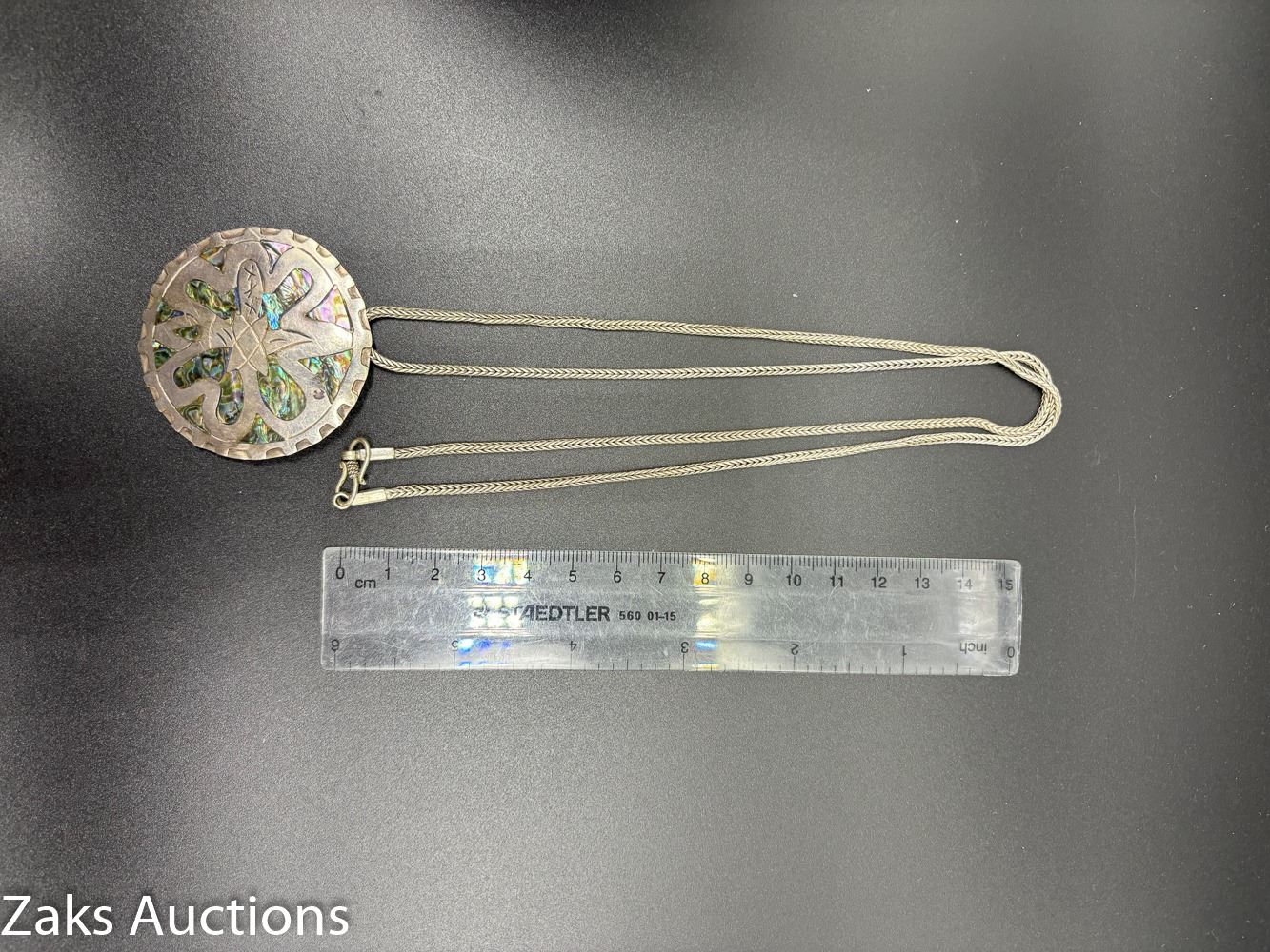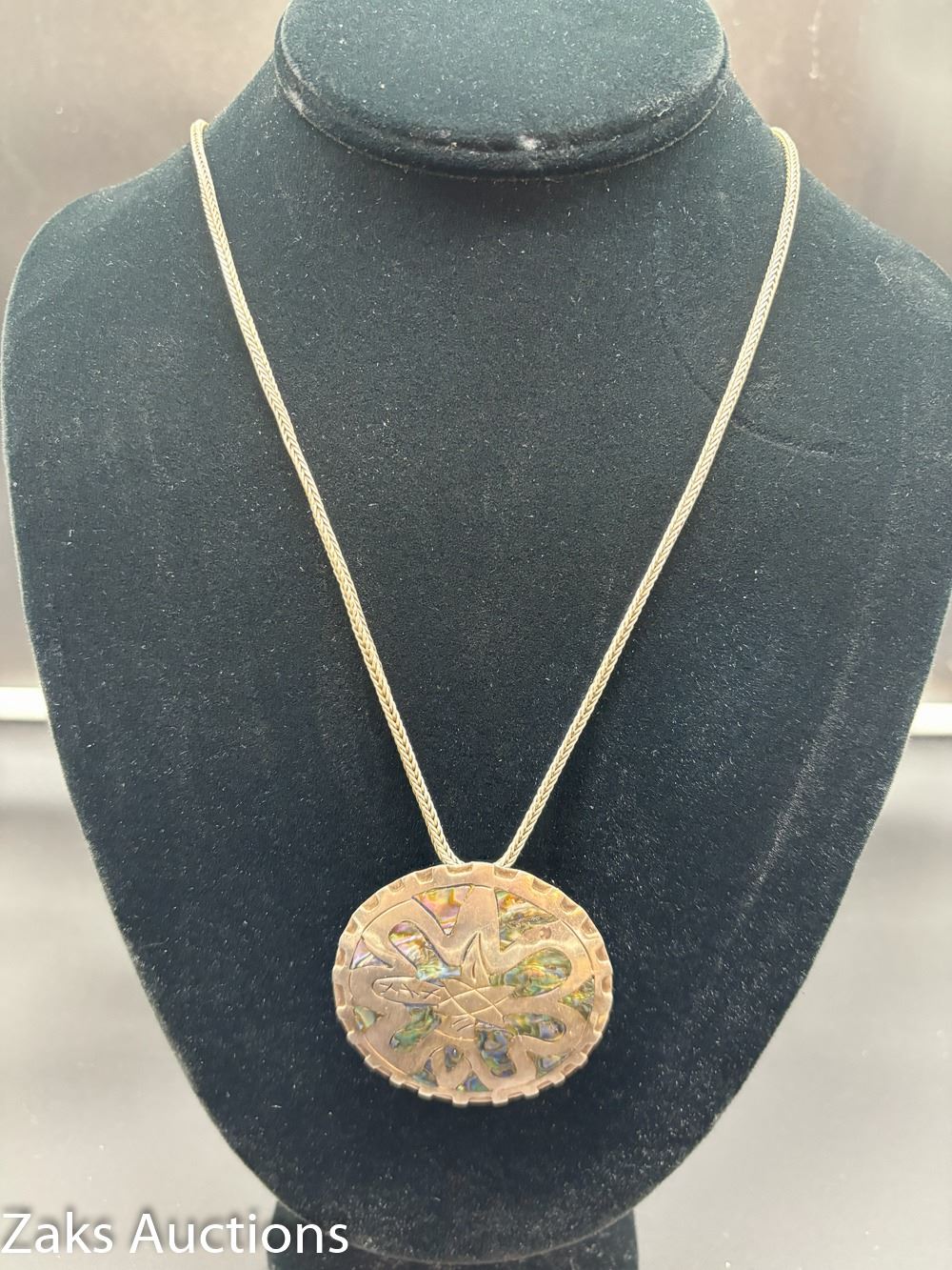 LARGE STERLING SILVER ABALONE ACCENTED PENDANT AND WEAVED SILVER CHAIN