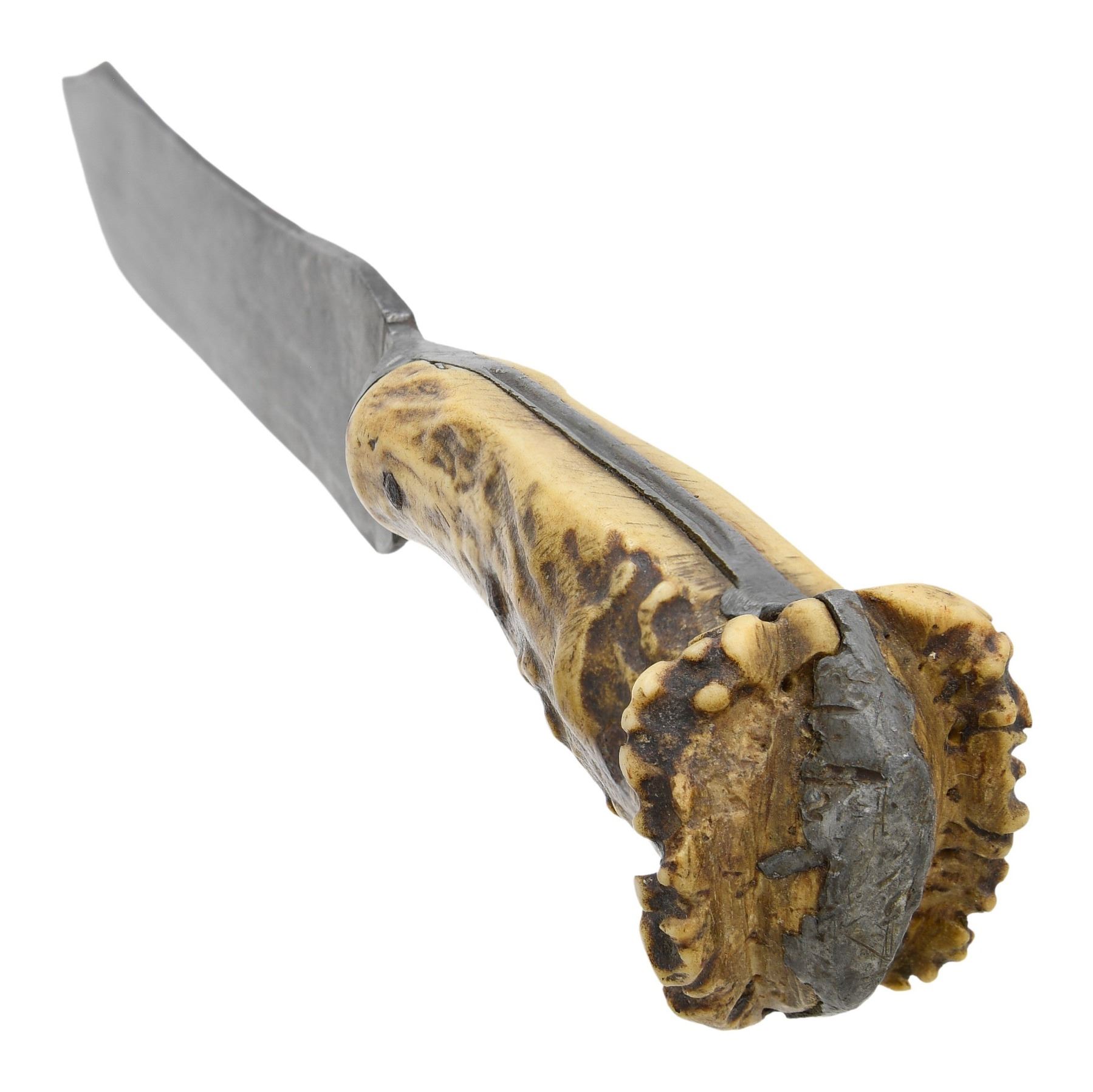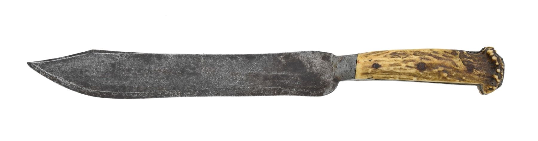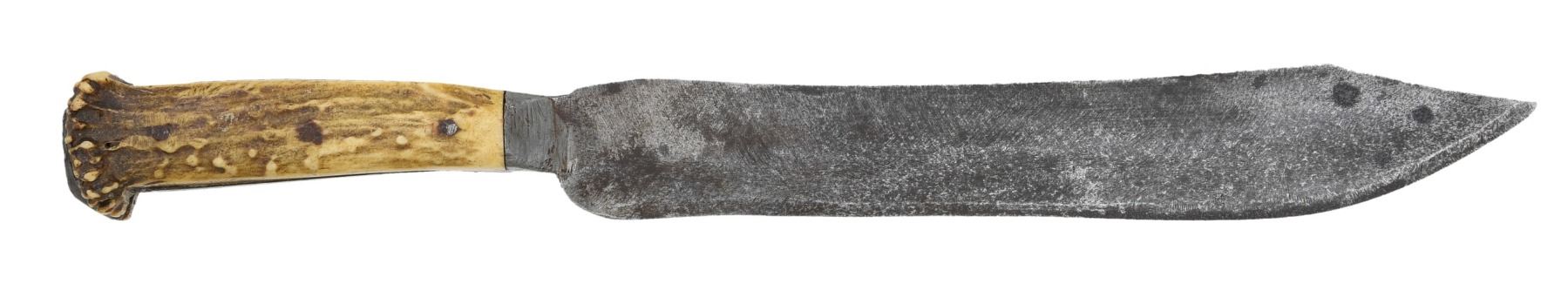 14.5"overall, 9.5" clip point blade, filed beveled clip point on one side only, other side flat, full tang covered with pewter, pewter bolster & pommel, pinned split crown stag handle. CONDITION: very good overall. PROVENANCE: Estate of Lewis Walker, Hudson, OH; Cowan auction lot 5, Oct. 30, 2019, The Esteemed Norm Greenberg Collection. (02-24849-9/JS). NON-GUN. $800-1,200.