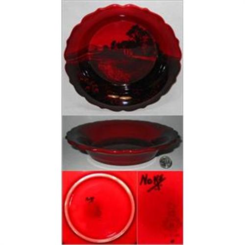 LARGE AND HEAVY ROYAL DOULTON NOKE SCENIC FLAMBE BOWL WITH COTTAGE & PASTURE MOTIF. Measures 10 inches across and 2.25 inch tall. Fully marked and signed NOKE. Excellent Condition.