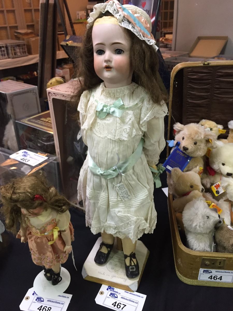LARGE ANTIQUE BRUNO SCHMIDT, BISQUE SOCKET HEAD, PORCELAIN DOLL WITH SLEEP EYES 28" HIGH MARKED BSW ON HEAD