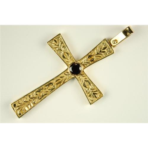 EXTRAORDINARY Vintage 14k GOLD CROSS circa 1950 measuring 2 3/4" in length x 2" in width. There is magnficent ENGRAVING with a round GARNET in the center.